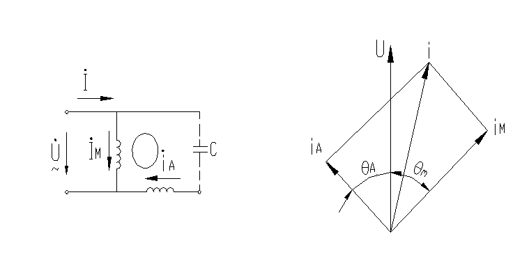 单相电容运转异步电动机的基本工作原理: 主绕组M与副绕组A的轴线在空间相隔90°电角度,副绕组串联一个电容C再与主绕组并接于电源。由于副绕组串联了电容所以副绕组中的电流在相位上超前于主绕组电流,这样由单相电流分解成具有时间相位差的两相电流M 和A,因而电机的两相绕组能产生圆形或椭圆形的旋转磁场。